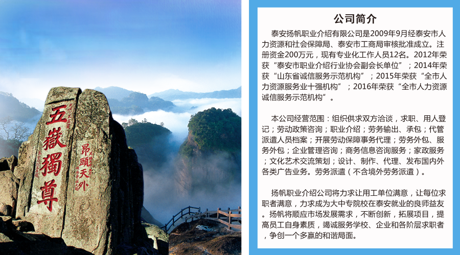 泰安揚(yáng)帆職業(yè)介紹有限公司是2009年9月經(jīng)泰安市人力資源和社會(huì)保障局、泰安市工商局審核批準(zhǔn)成立。注冊(cè)資金200萬(wàn)元,現(xiàn)有專業(yè)化工作人員12名。2012年榮獲“泰安市職業(yè)介紹行業(yè)協(xié)會(huì)副會(huì)長(zhǎng)單位”;2014年榮獲“山東省誠(chéng)信服務(wù)示范機(jī)構(gòu)”;2015年榮獲“全市人力資源服務(wù)業(yè)十強(qiáng)機(jī)構(gòu)”;2016年榮獲“全市人力資源誠(chéng)信服務(wù)示范機(jī)構(gòu)”。